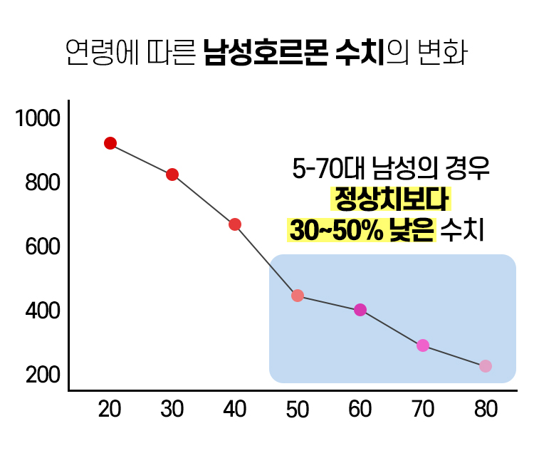 국내 중년 남성중 30% 이상이 ‘남성 갱년기 증상’을 겪고 있는 것으로 알려졌다. 성욕감퇴, 발기부전, 성관계 횟수 감소, 피로감, 무기력감 등 다양한 증상으로 나타나며 남성호르몬인 테스토스테론은 인지능력에도 영향을 줘 기억력, 인지력, 집중력 감소 발생, 체모 감소, 관절통, 피부 노화 등의 신체적 증상도 함께 나타날 수 있다.