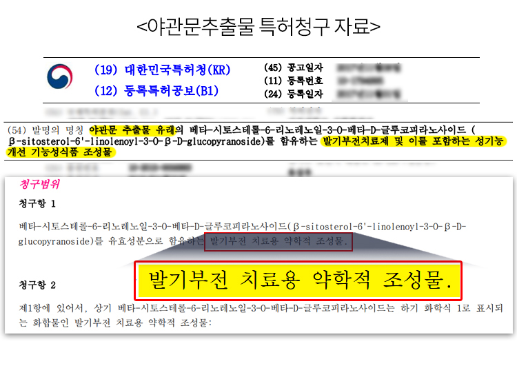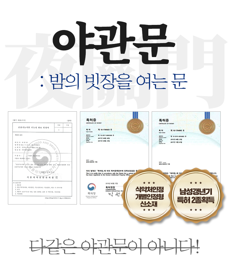 '야관문 추출물'은 인체적용시험 결과 남성 성 기능 개선에 탁월한 효과를 보였으며 이에 따라 특허를 획득한 신소재로 최근 중년 남성들 사이에서 실제 섭취 후기가 빗발치고 있다.