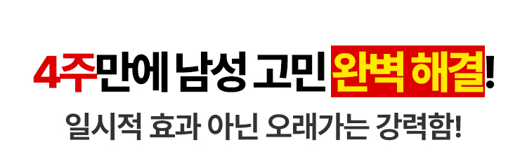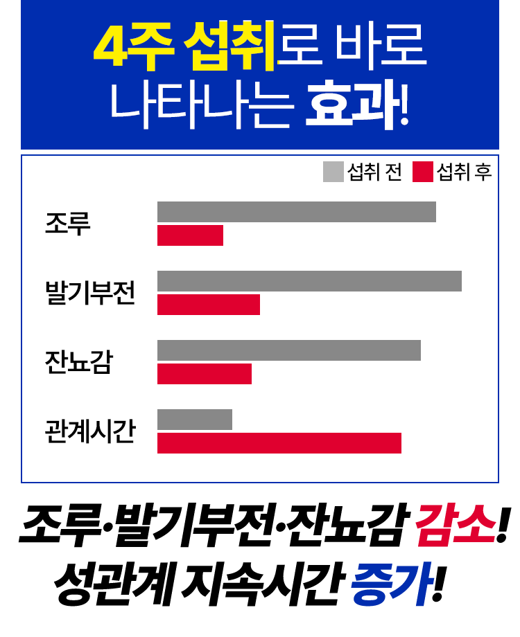부스터엑스를 4주간 섭취한 40대 이상 남성들을 조사한 결과, 위 4가지 항목에서 눈에 띄는 효과가 확인 되었다. 모든 항목에서 약 50%이상 증가 또는 감소 효과로 부스터엑스의 효과가 확실히 증명된 셈이다.