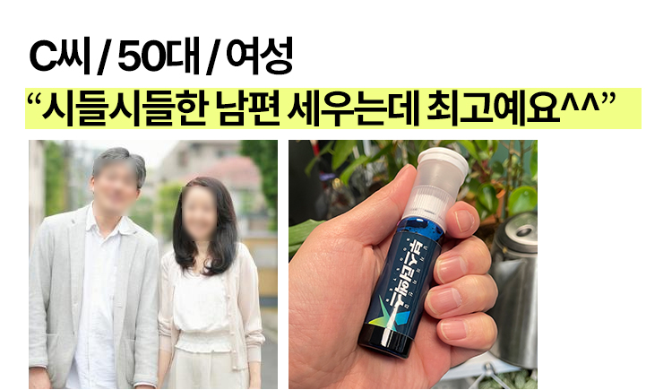 경기도 용인에 거주하는 여성 C 씨는 최근 부부관계가 소원해져 불만이 있던 상황. 최근 알게 된 '부스터엑스' 섭취 후 몰라보게 달라진 남편의 태도에 이젠 C 씨가 손사래를 칠 정도. 5년간 각방 쓰던 부부가 얼마 전부터 각방 생활을 청산하고 신혼으로 돌아간 것 같은 기분을 만끽하고 있다며 C 씨의 지인들에게도 강력하게 권하고 있다고 한다.